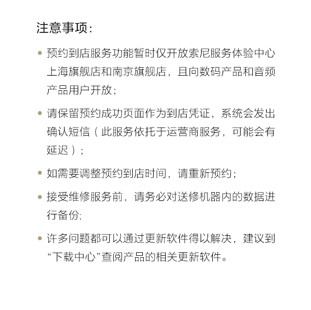 ● 预约到店服务功能暂时仅开放索尼服务体验中心上海旗舰店和南京旗舰店,且向数码产品和音频产品用户开放;